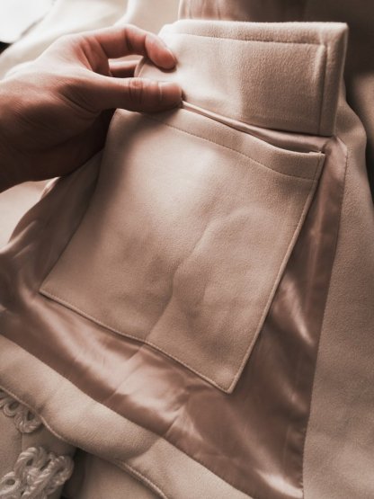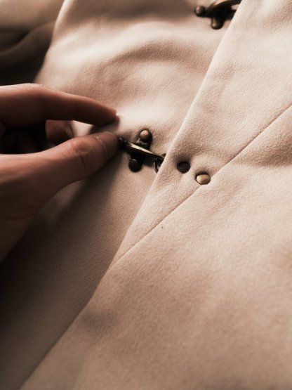 Jacket features hanfu inspired silhouette with detachable and retractable beige panel system. Asymmetric front closure with copper finished metal buckles and faux suede fabric to complete the piece. Conceived for all-season versatility, each element has been meticulously chosen to embody quiet luxury and endure form. A testament of our craftsmanship, and the art of elevated essentials.