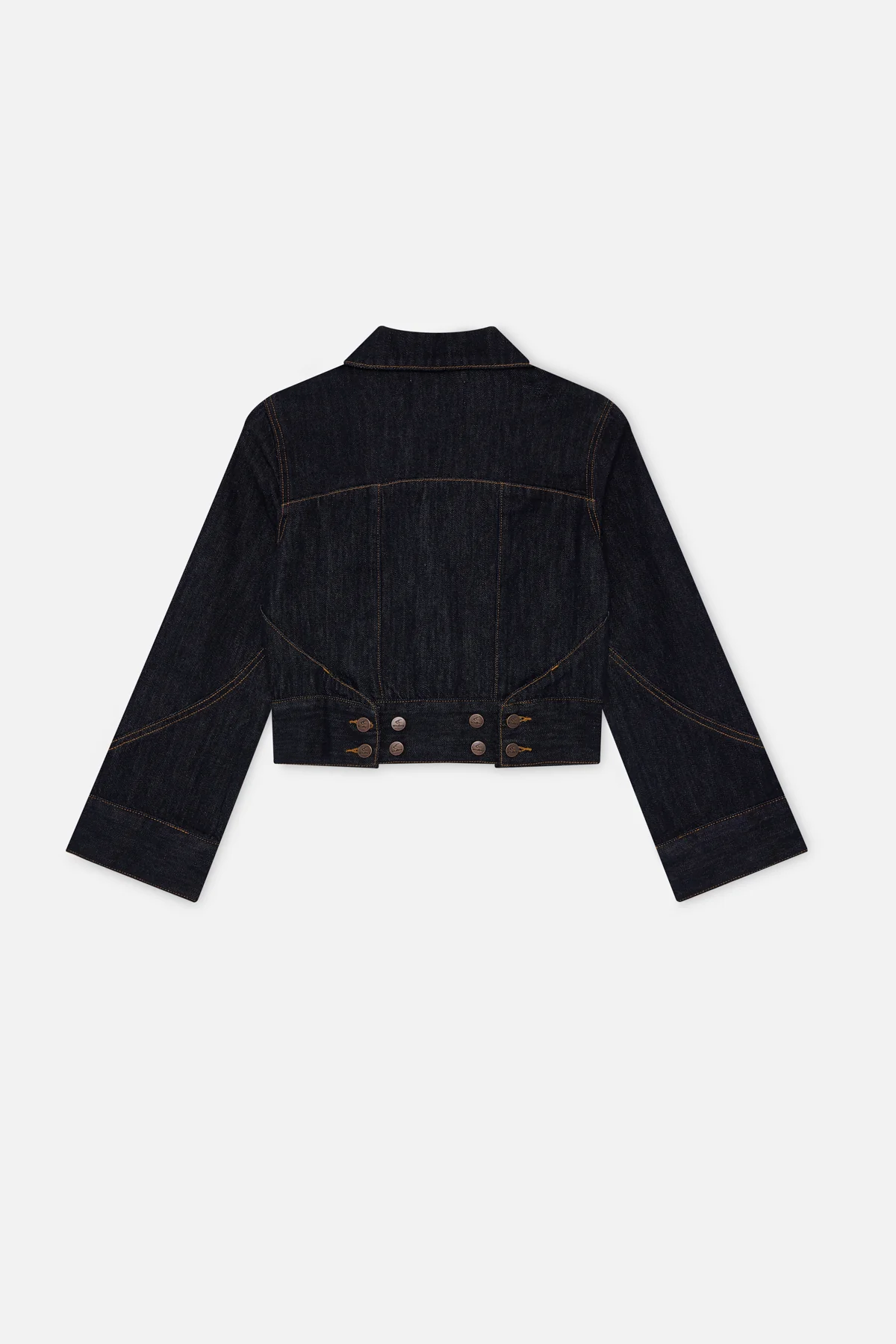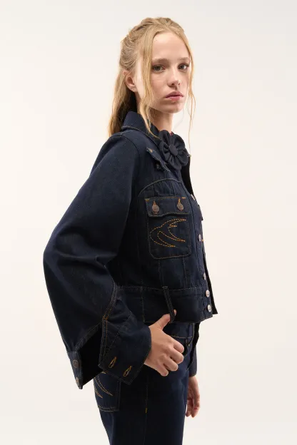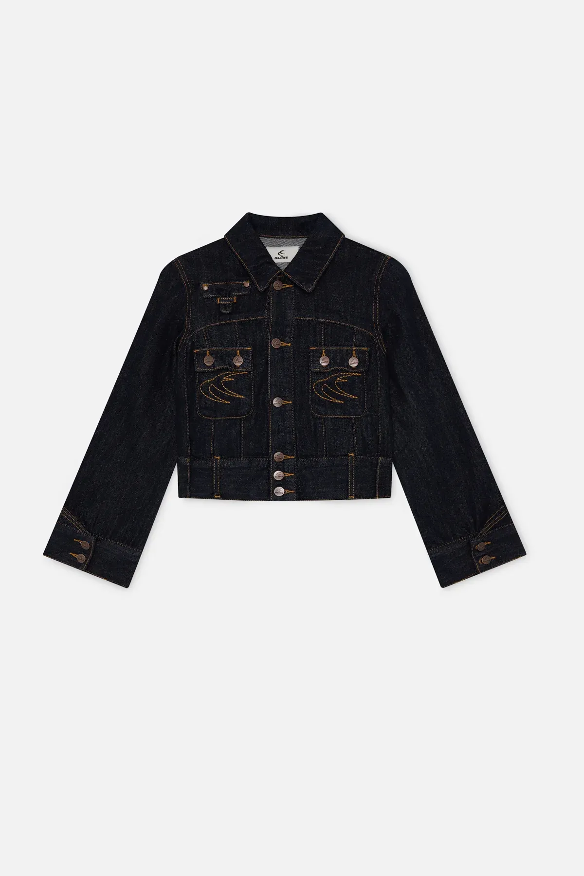 Wash Cropped Denim Jacket made from rigid cotton denim, featuring a boxy fit with a structured collar, flap chest pockets, and button front closure. Detailed with contrast stitching, embroidery on the pockets, and adjustable buttoned tabs at the waist and cuffs.